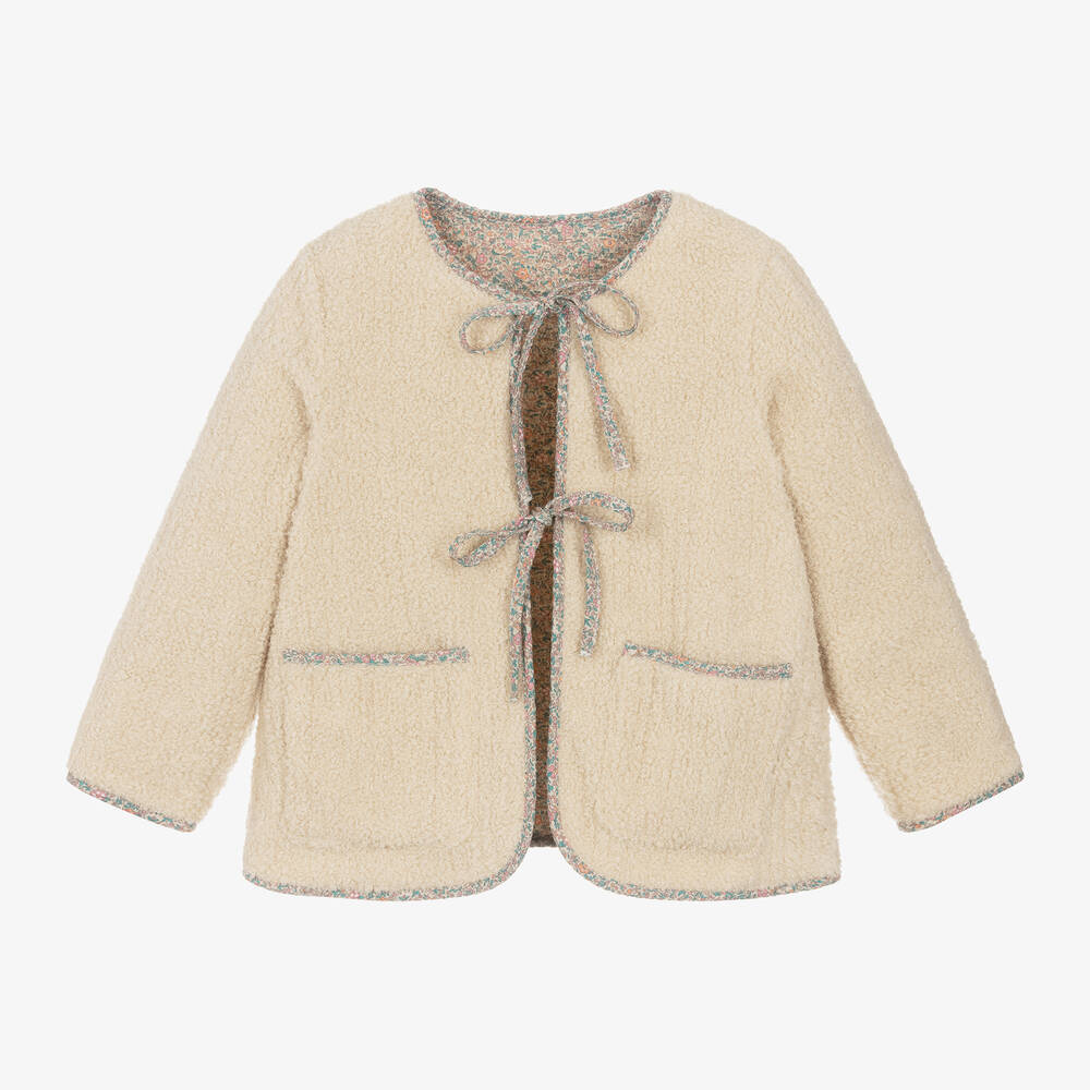 A reversible jacket for girls by Spanish brand Foque. Made in soft borg fabric, the beige side has two front pockets and contrasting floral trims. The other side is beautifully patterned with pink, purple and blue flowers and finished with diamond-shaped stitching for a quilted look. This lighter-weight jacket fastens with ties on the front, adding an extra layer of warmth.