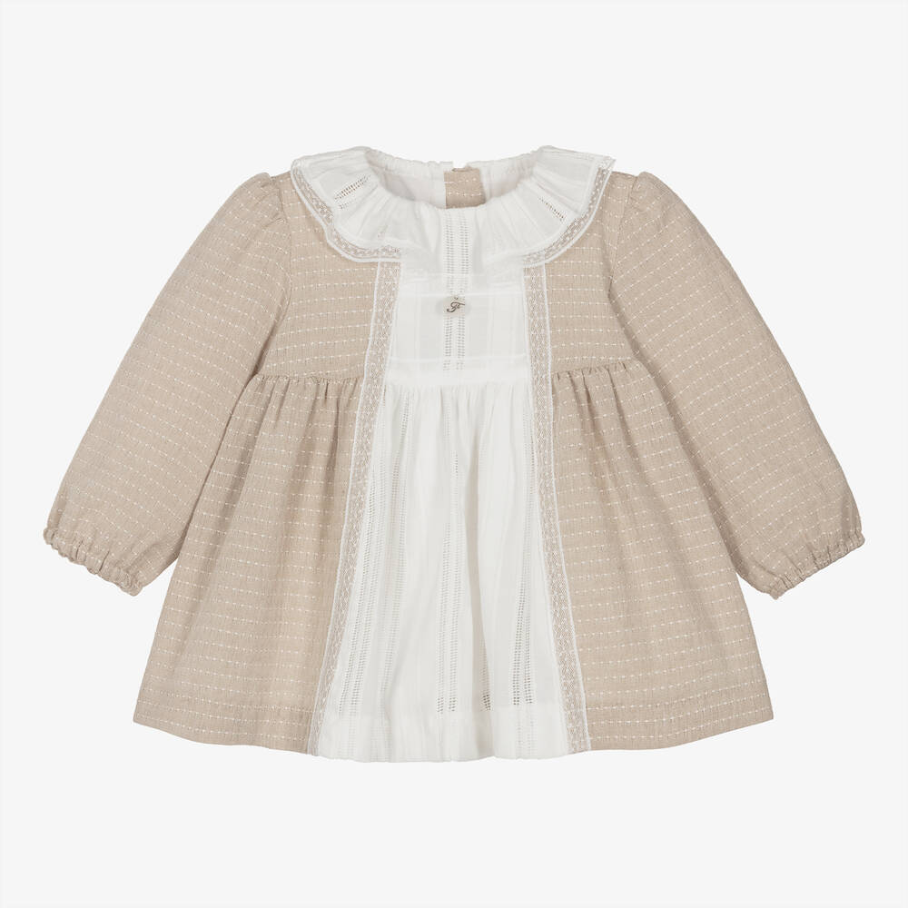 Beige dress for little girls by Spanish brand Foque, made in soft cotton with a white stitch pattern. It has a ruffle collar and a white panel on the front with pretty lace trims and a mother-of-pearl logo charm. Fully lined for comfort, it has mother-of-pearl button fastenings on the back and comes with a matching pair of knickers.