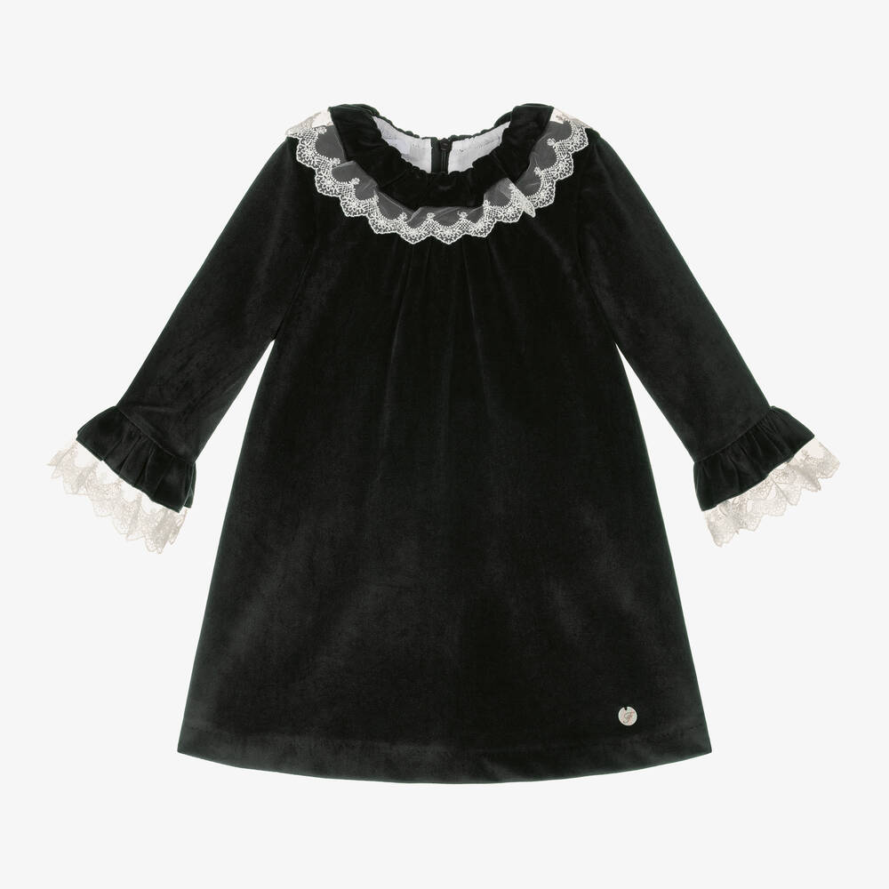 A charming black dress for girls by Foque, made from soft velvet. Elegantly styled, this long-sleeved dress has a subtle A-line shape with an inverted pleat on the front. The frilled collar and cuffs are trimmed with pretty white lace and there is a mother-of-pearl logo charm near the hem. It has a lightweight lining and fastens with a concealed zip on the back for a neat finish.
