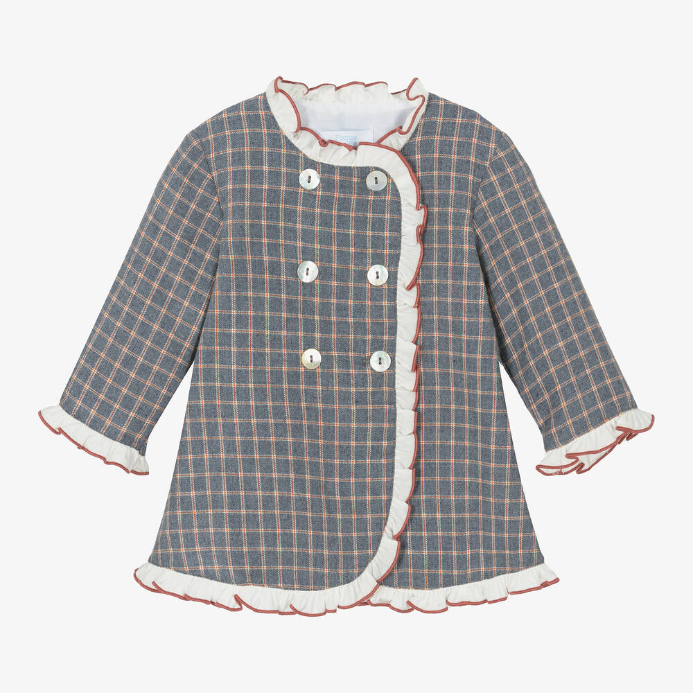 Exclusive to Childrensalon, a smart, blue, brushed cotton dress for little girls by classic Spanish brand Foque, checked in terracotta red. Beautifully soft, it has white voile frills with coordinating terracotta red embroidered trims, and fastens with double-breasted, iridescent, mother-of-pearl buttons. The dress is lined in lightweight, lace-trimmed cotton voile for comfort and comes with useful, matching bloomers.