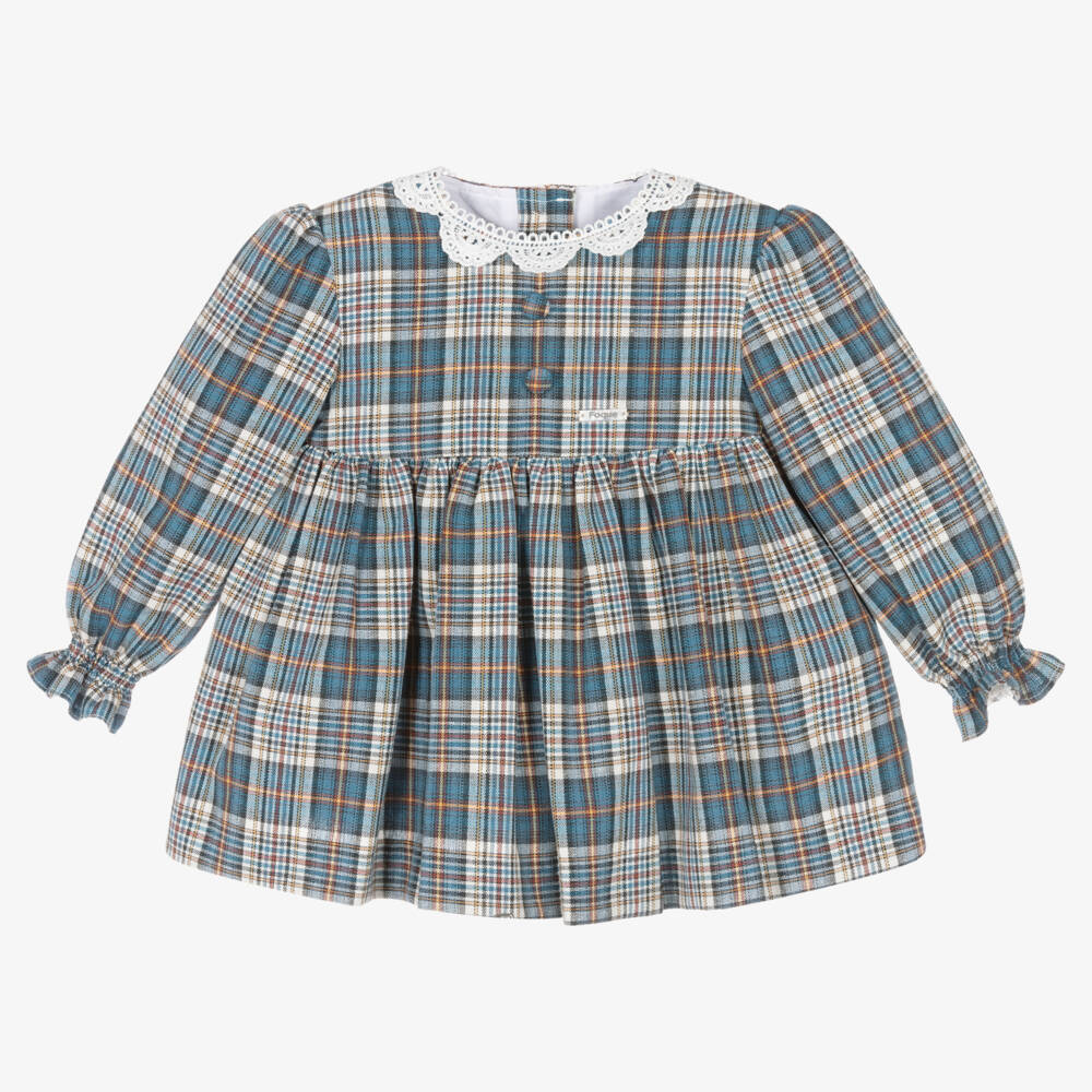 From Spanish brand Foque, a checked dress for little girls in blue, ivory and red. Made in a softly woven cotton-blend fabric and fully lined, this lovely traditional style has a delicate ivory lace collar, decorative buttons and a small logo plate on the bodice. The long sleeves are puffed at the shoulders and have gently elasticated ruffled cuffs, and the skirt is gathered for a feminine finish. The dress fastens with buttons on the back and pairs with matching knickers to complete the look.