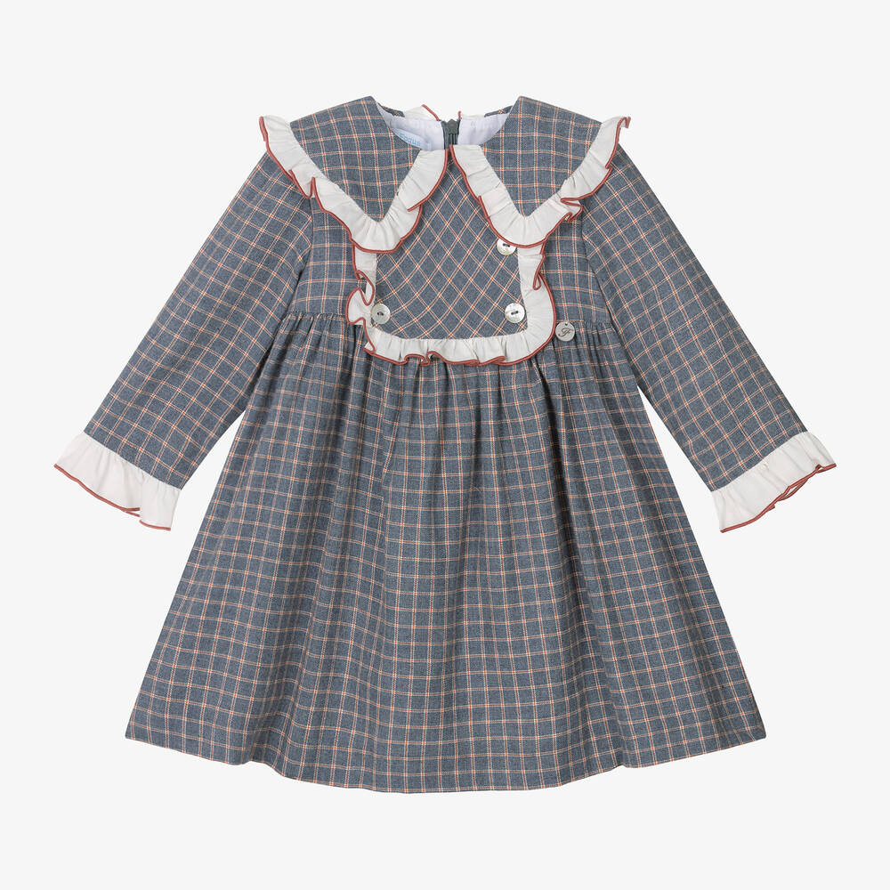 Deep grey-blue dress for girls by Foque, made in cosy, brushed cotton flannel. Patterned with terracotta red check, this classic dress has a bib front with mother-of-pearl faux buttons, long sleeves, and delicate voile trims. The back secures with a hidden zip for neatness and the dress is under-layered with a cotton-mix lining for comfort.