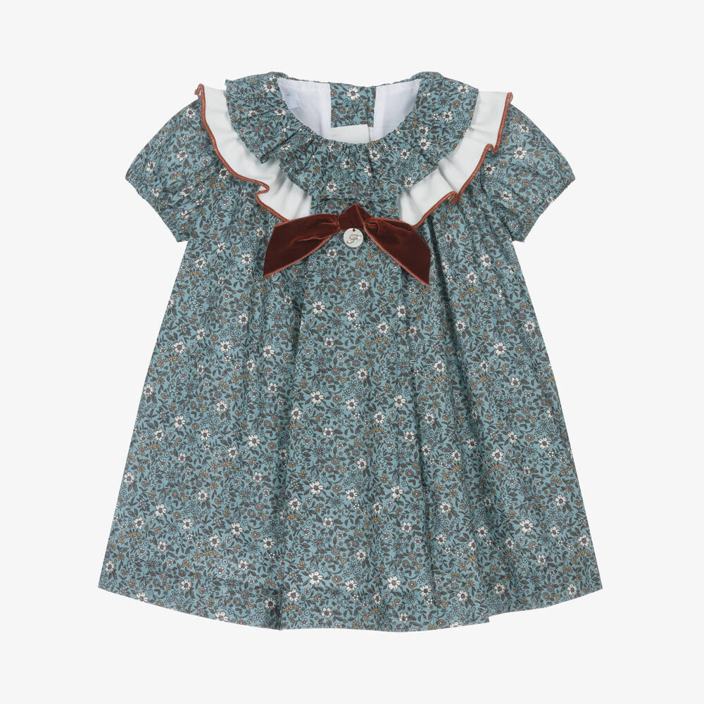 Exclusive to Childrensalon, a lovely blue dress for little girls by Spanish brand Foque, with a white and yellow floral print. Made in lightweight poplin, it has a ruffled collar with a white twill ruffle below, trimmed in russet brown. A fixed, russet brown velvet bow and iridescent logo charm give a sweet finishing touch. The dress has gently elasticated cuffs on the sleeves and wide pleats on the front and back. It fastens with mother-of-pearl buttons on the back and is fully lined in voile for comfort.