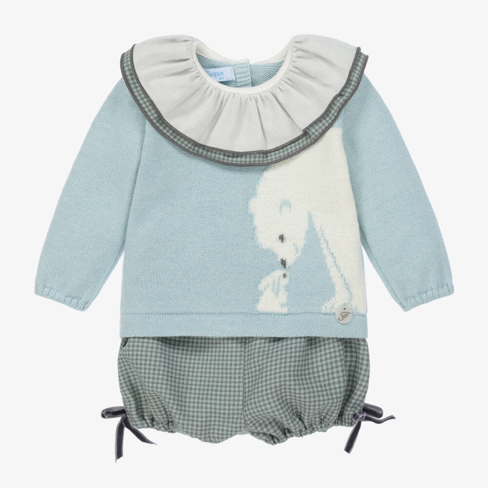 Lovely blue and green shorts set for little girls by Foque, made in soft wool and cotton. The pale blue wool mix jumper has an adorable polar bear and bunny design on the front. Fastening with buttons on the back, it has a white ruffle collar trimmed with a green check pattern. This same pattern can be found on the accompanying cotton shorts, which have cute dark grey velvet bow trims on the legs.