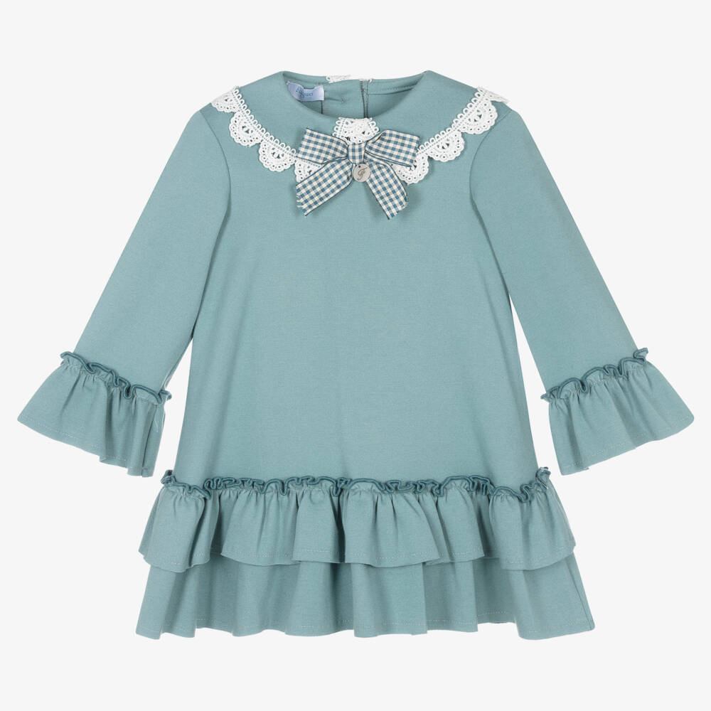 Beautifully combining comfort and style, a Milano jersey Foque dress for girls is in a lovely duck egg blue shade. Soft and stretchy, this easy-to-wear style has a rounded collar with white lace edging and pretty ruffle trims. Fastening with buttons on the back, it has a checked bow and logo charm on the front to complete the look.