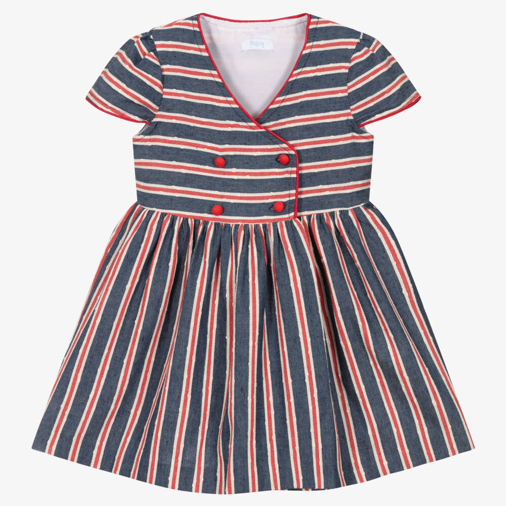 Beautiful blue, red and white striped dress for girls from Foque, made in a mid-weight cotton blend twill. Fully lined for comfort, this dress has a double-breasted front which fastens with complementary red rounded buttons. It has delicately puffed sleeves for a beautiful feminine touch.