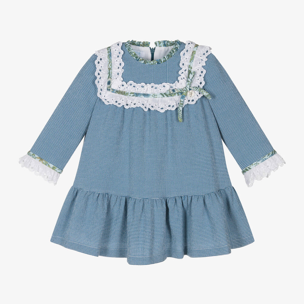 Pretty blue gingham dress for girls by classic Spanish brand Foque, made in a slightly textured, viscose blend. The dress has a sweet, white, lace-edged bib, with a blue and green floral trim and bow, embellished with a logo charm. There is a matching, stand-up floral collar and coordinating trims on the cuffs. The dress is lined in voile for comfort and has a zip fastening on the back.