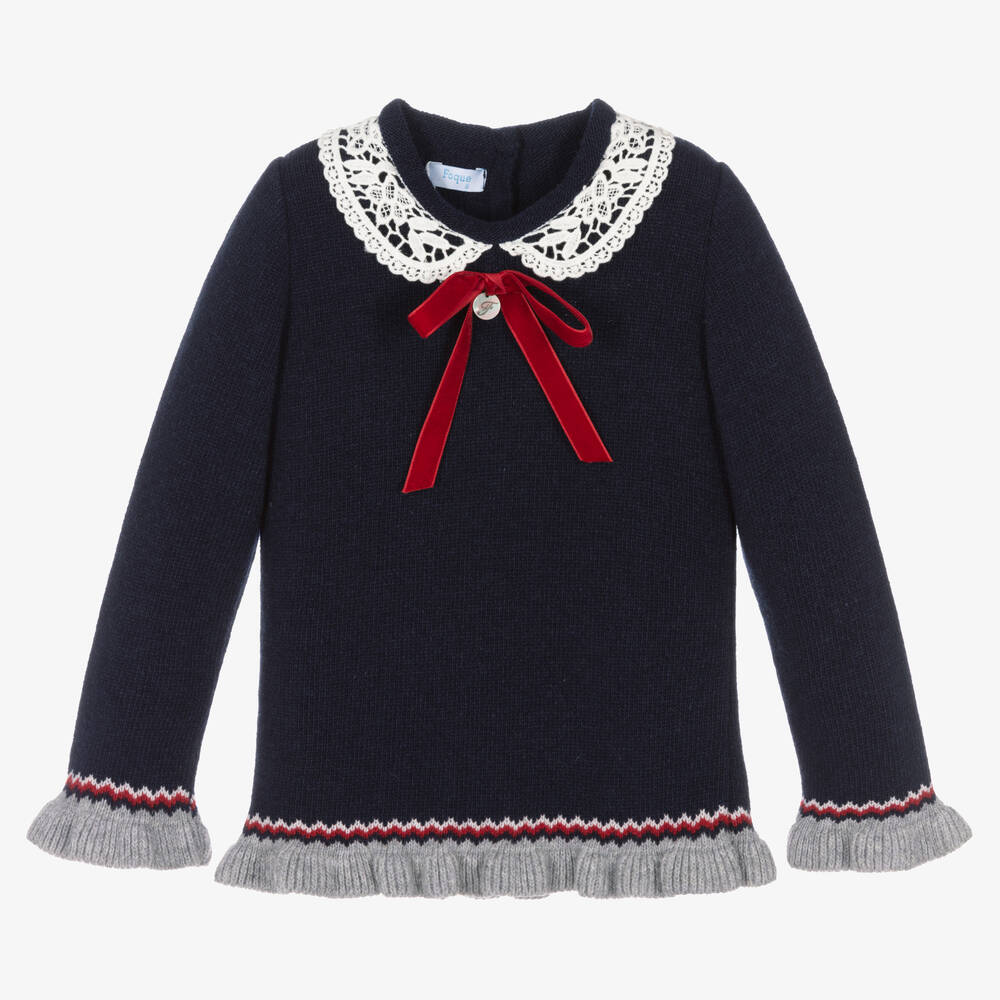 Beautifully combining timeless style and cosy warmth, this navy blue jumper for girls is from Spanish designer Foque. Knitted in soft wool, it has a delicate ivory lace collar with a red velvet bow and central logo charm. For a charming finish, the frilly grey ribbed cuffs and hem are trimmed with a red and white zig zag pattern. Button fastenings on the back help with dressing.