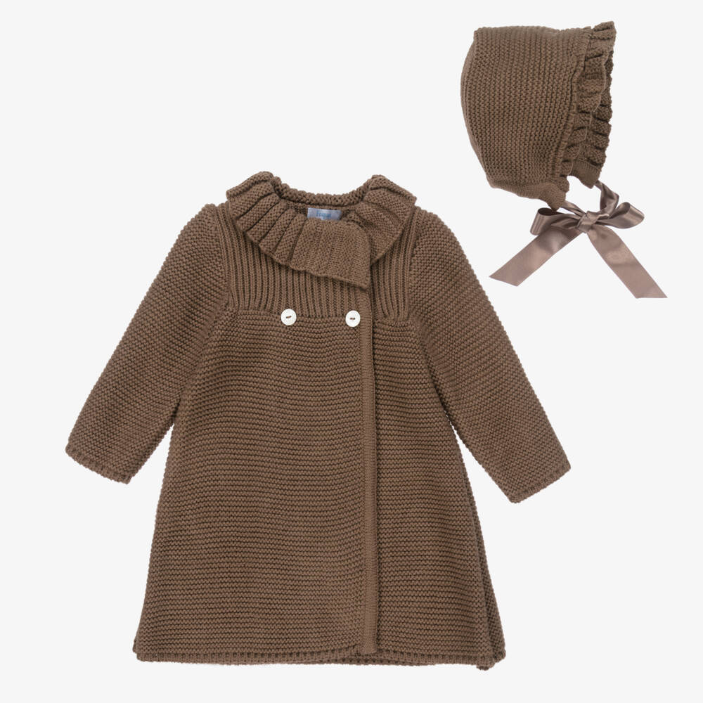 Younger girls brown coat and bonnet set from Foque, knitted in soft, mid-weight acrylic. The cosy knitted coat has double-breasted pearlescent button fastenings and a smart asymmetric collar. The hat fastens with silky brown ribbon ties under the chin.