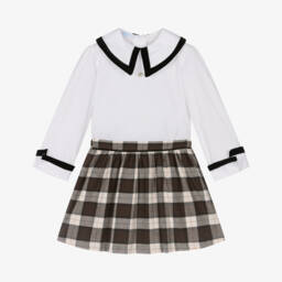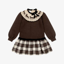 A charming brown cape for girls by Foque, knitted in a soft, ribbed wool blend with a touch of cashmere for added luxury. Lovely for layering in the cooler months, this cosy cover-up has a large fixed hood with a cute pom-pom on the top and fastens with a tie on the front.