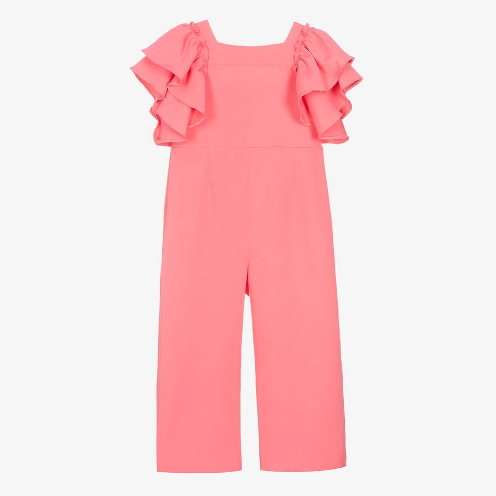 Coral pink jumpsuit for girls from Foque, made in smooth poplin. This beautiful jumpsuit has a fashion-forward shape with large ruffles on the shoulders and a slightly cropped wide leg. The concealed zip on the back makes dressing easy without distracting from the cut.