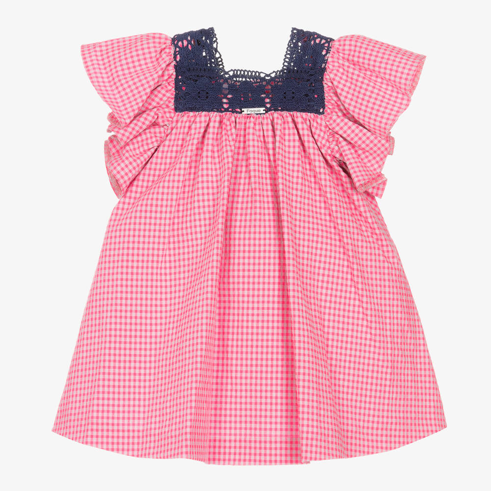Fuchsia pink dress for girls from Foque, made in mid-weight cotton blend seersucker. The all-over gingham check is beautifully balanced with pale grey and a navy blue crochet neckline draws the eye. It has a flowy A-line cut and frilled sleeves for a feminine silhouette. To make dressing easier, there are mother of pearl button fastenings no the back.