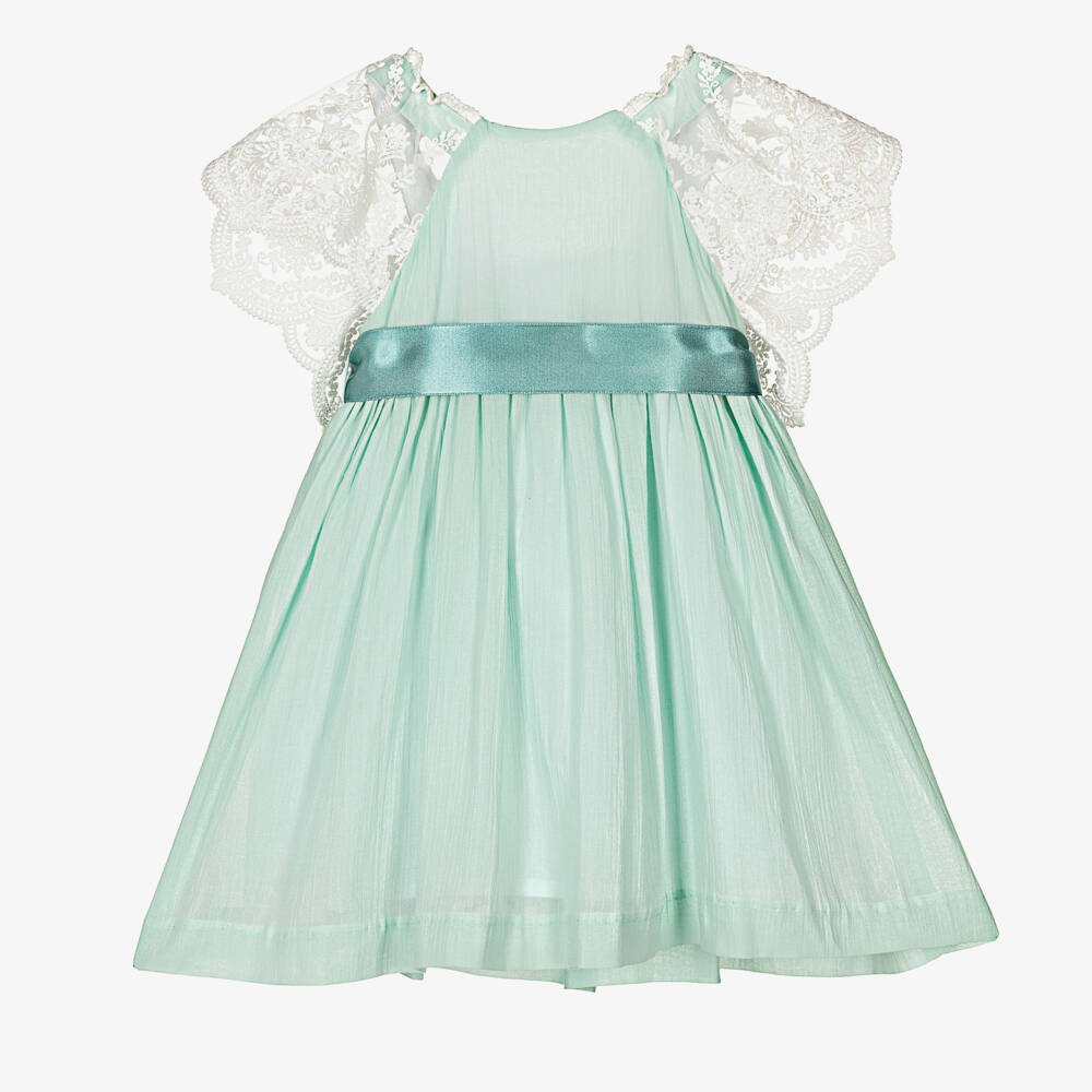 In a lovely sea green shade, this pretty Foque dress for girls is made in beautifully fine and lightweight cotton cheesecloth. It has exquisite ivory lace flutter sleeves that extend down the V-back for a pretty look. Lined for comfort, the dress fastens with a concealed zip on the back and comes with a removable green satin ribbon to complete the look.