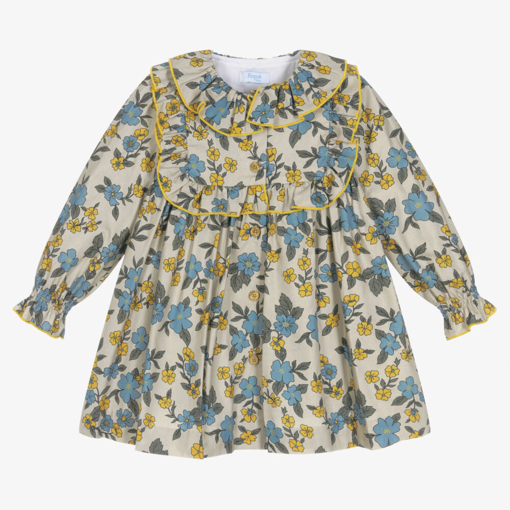 Girls lovely grey dress with blue, yellow and green floral print from Spanish brand Foque. Buttoned down the front, it is made in lightweight cotton twill with a square bib front styling, pretty ruffle trims and gently elasticated cuffs. The lightweight white polycotton lining has a delicate lace-trimmed hem.