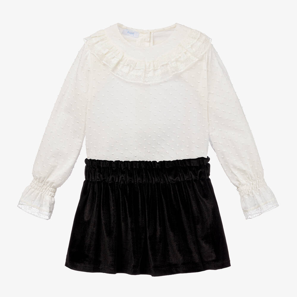 A smart blouse and skirt set for girls by Spanish brand Foque. The elegant ivory blouse is made in lightweight plumeti cotton, with a pretty lace-trimmed ruffle collar. The long sleeves have gently elasticated cuffs, with identical lace trims. There are pearlescent button fastenings on the back. Made in stretchy velour with a lovely sheen, the skirt has an elasticated waist for a comfortable fit.