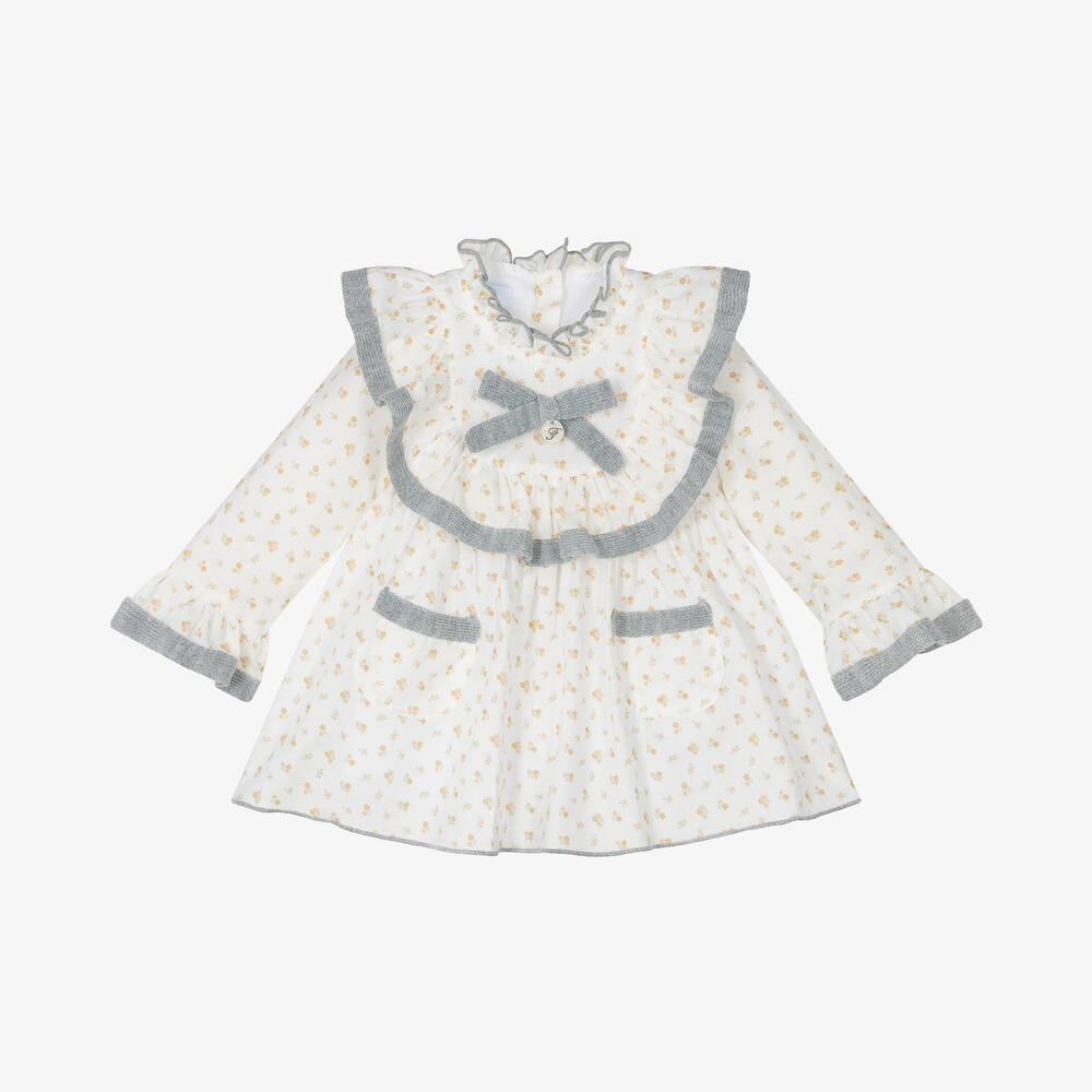 Pretty ivory dress for little girls by Spanish brand Foque, made in soft, lightweight cotton. Patterned with a dainty yellow floral print, it has grey knitted edging on the ruffle trims and front patch pockets. Fully lined for comfort, it has a grey knitted bow on the front with a mother-of-pearl logo charm. It fastens neatly on the back with mother-of-pearl buttons and comes with a matching pair of knickers.