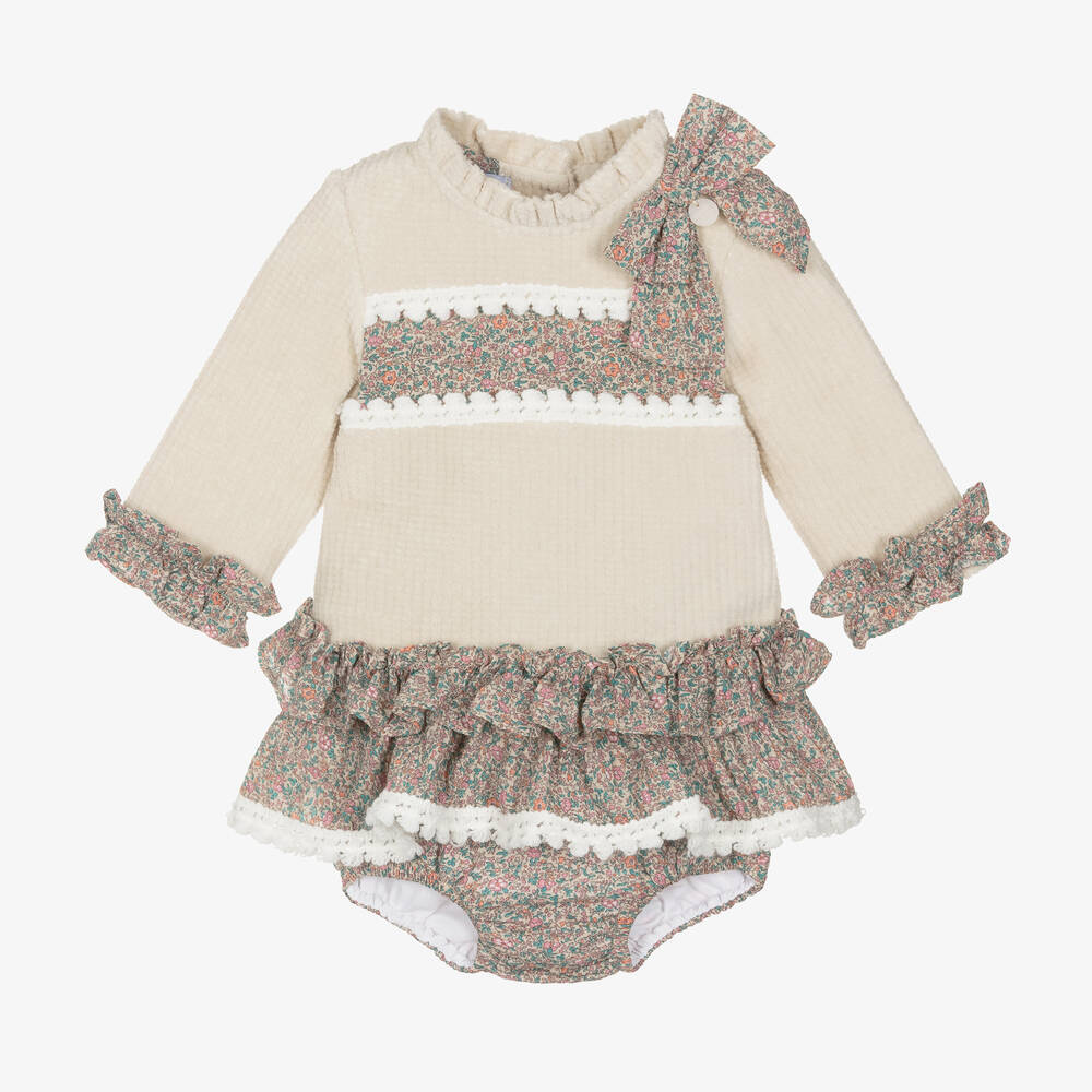 A pretty shorts set for little girls by Foque, in a lovely warm shade of ivory. The top is made in a softly textured cotton blend with contrasting pink and blue floral trims. It has a high, ruffled neckline and a decorative bow on one side for added charm. The matching cotton shorts have a frilly layer and an elasticated waistband. A lightweight lining ensures a soft and gentle feel next to the skin.
