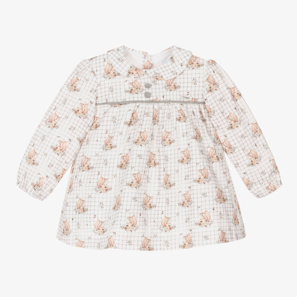 A lovely ivory dress for little girls by Spanish brand Foque, woven in soft and lightweight cotton. Designed with long sleeves and a Peter Pan collar, this sweet dress is patterned with woodland squirrels on a grey grid background. There are decorative, fabric-covered buttons and a neat trim across the bodice in a contrasting design. It secures on the back with button fastenings and has a lightweight lining with a delicate lace edge. The matching knickers have an elasticated waist and can be worn comfortably over a nappy.