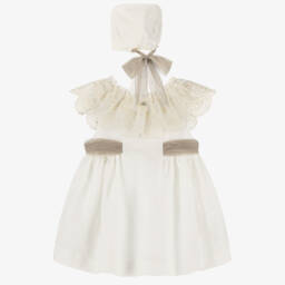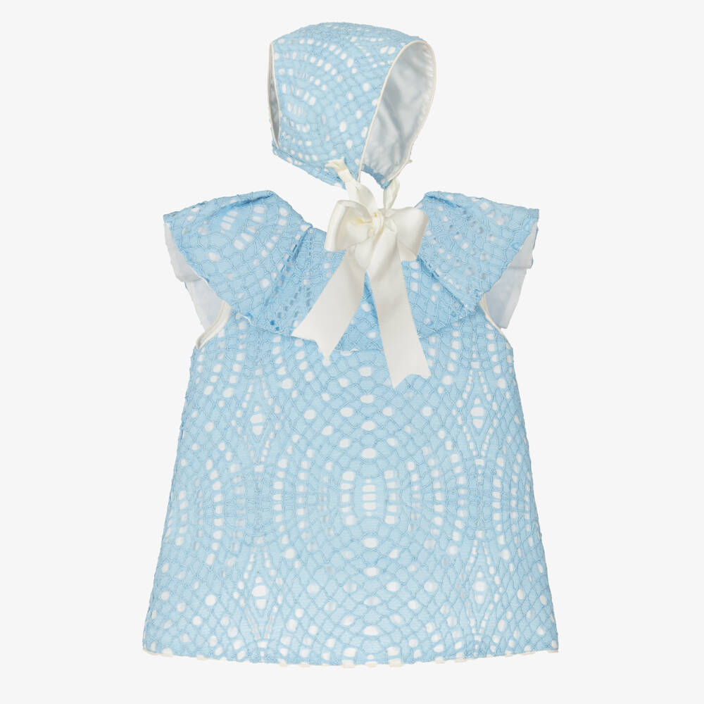 A lovely light blue and white dress set for little girls by Foque. Fully lined, all pieces are made from a lightweight lace-look cotton-blend fabric. The pretty dress has a charming frilled neckline and pearlescent button fastenings with an ivory bow detail on the reverse. The raised hem at the back allows the coordinating bloomer shorts, with a comfortable elasticated waist, to remain visible. There is a matching bonnet with sweet grosgrain ribbon ties to complete the look.