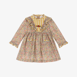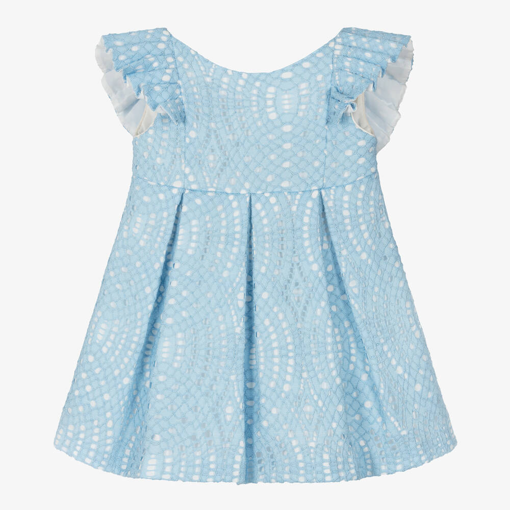 A charming light blue and white dress for girls by Foque, made from beautiful cotton-blend cutwork lace. In an elegant and classic style, it has pretty frills over the shoulders and a lovely box pleated skirt. It is fully lined with an extra ruffled lining on the skirt for added volume and fastens with a concealed zip on the back for a neat finish.