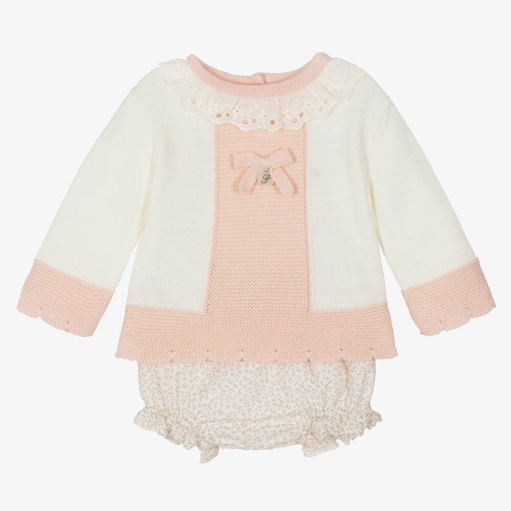 Ivory and pink shorts set for little girls by Spanish brand Foque. In a beautifully soft knit, the sweater has a decorative pink bow on the chest, pretty scalloped trims and a pearlescent disc sewn on the front. The traditional ruffle collar is delicately embroidered with tonal florals and finished with cutwork detailing. For a lovely coordinated outfit, the woven bloomer shorts have a lightweight lining, short frill legs and an elasticated waistband. They are patterned with little cherries for a sweet finish.