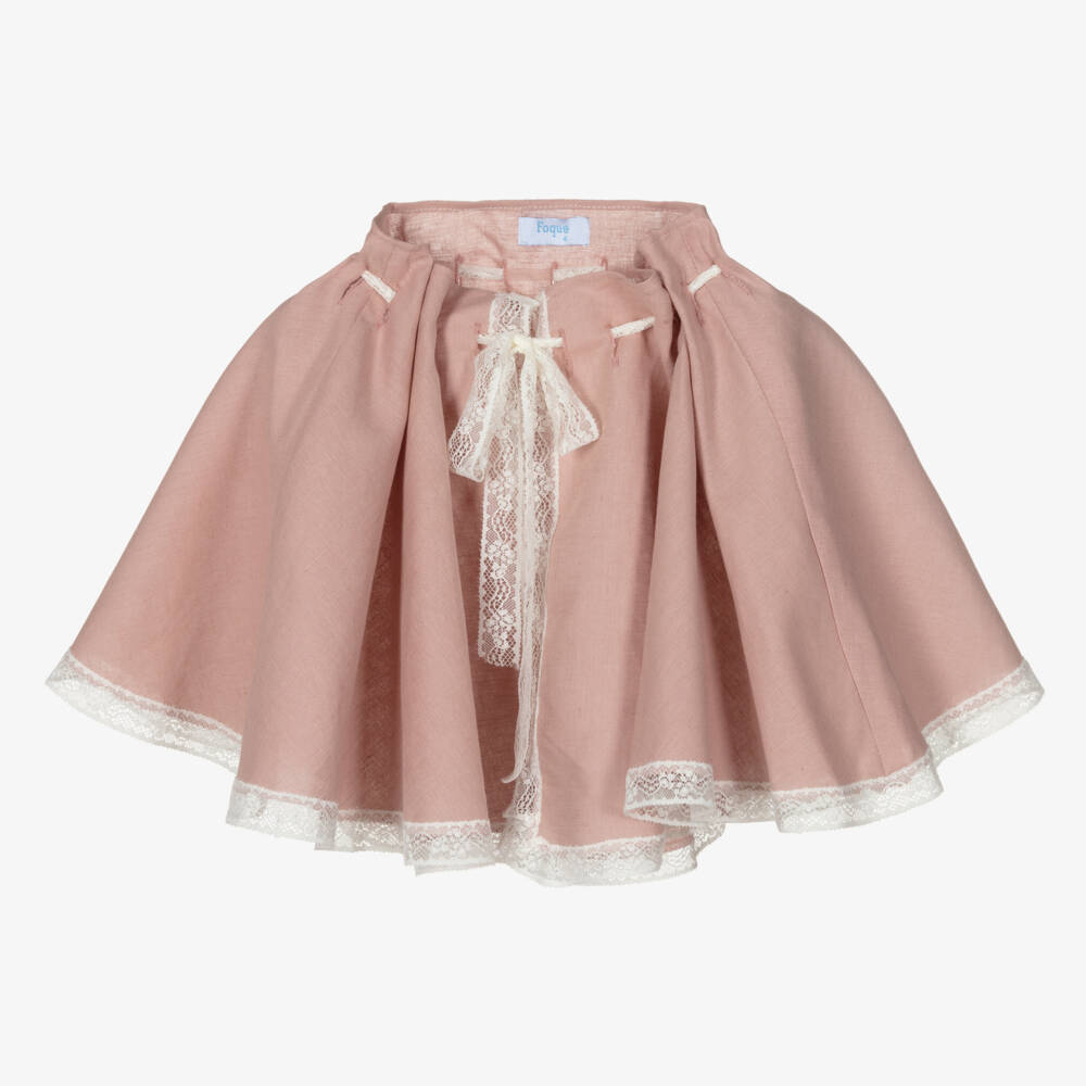 Dusky pink cape for girls by Foque, made in a lightweight linen and cotton blend. Ideal for a special occasion, it covers the shoulders and upper arms, and has ivory lace trims and ties. There is a pearlescent logo tab on the hem.