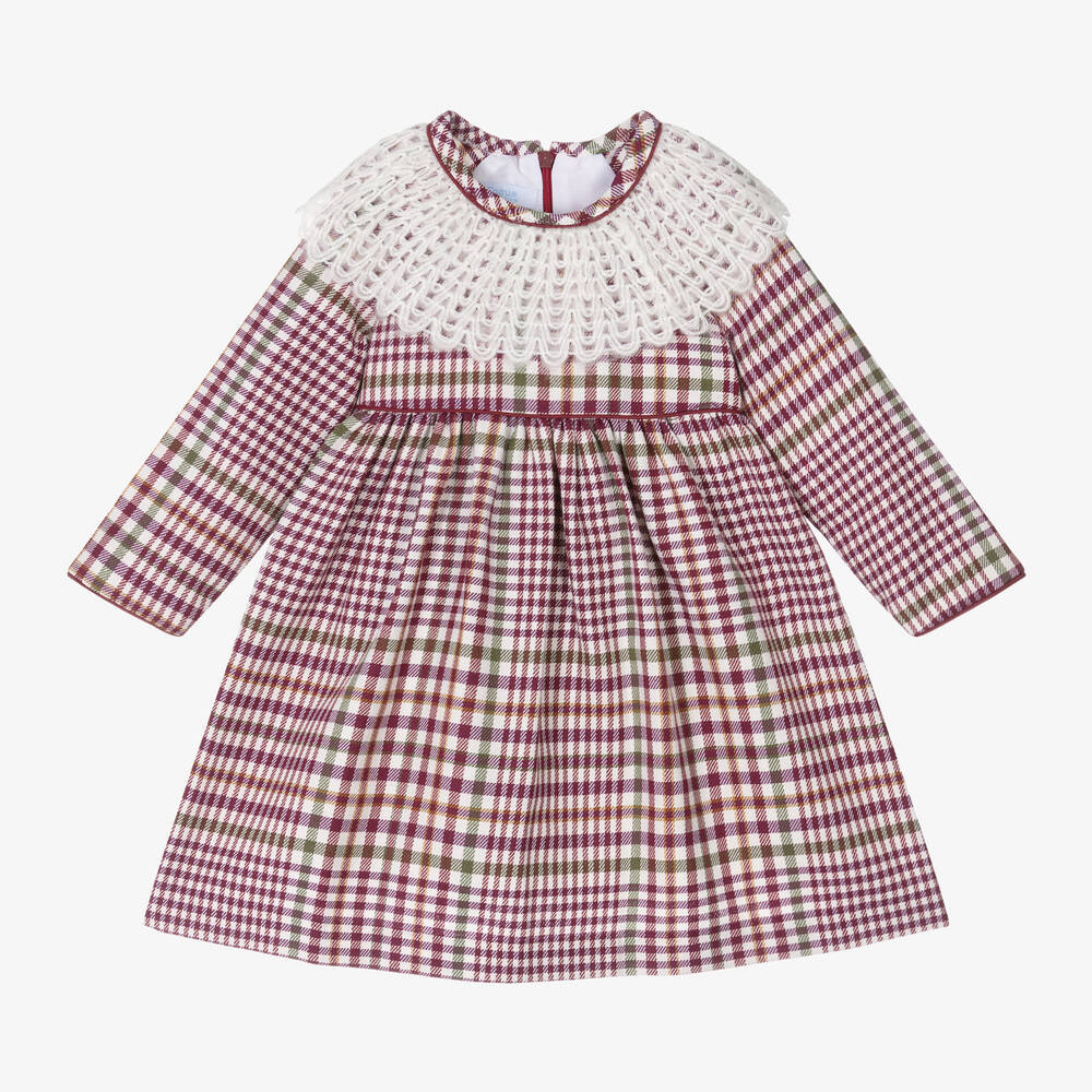 A lovely dress for girls by Spanish brand Foque, woven in a charming ivory and burgundy purple check pattern. It is made from a soft blend of cotton and viscose with a comfortable lightweight lining and long sleeves. The timeless design is accentuated with a beautifully knitted ivory collar and simple burgundy red trims. It fastens with a concealed zip on the back for a seamless finish.