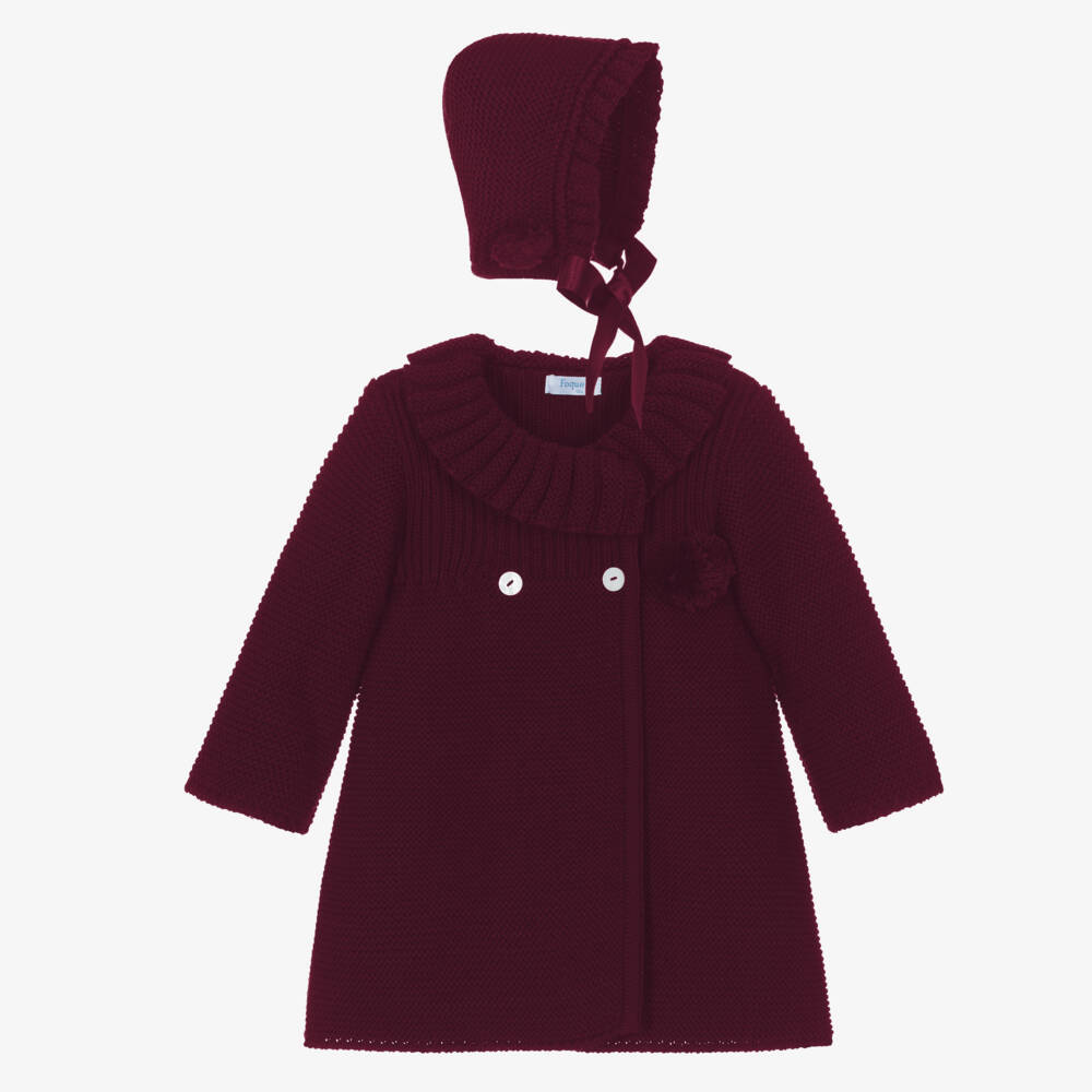 Lovely, traditionally styled deep purple coat and bonnet set for younger girls from Foque, made in a cosy, mid-weight knit. The coat has double-breasted pearlescent button fastenings and a smart asymmetric collar. A sweet pom-pom on the front adds a fun touch. The matching bonnet fastens with silky ribbon ties under the chin.