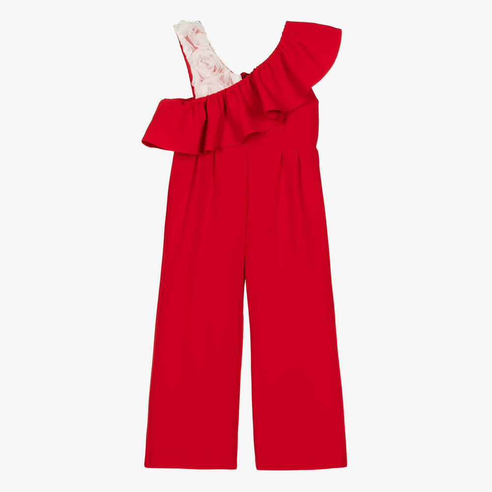 Elegant red special occasion jumpsuit for girls by classic Spanish designer Foque. Made in smooth crêpe with a slight stretch for comfort, it has a large, asymmetric ruffle across the bodice, over one shoulder and across the back. On the other shoulder is a strap embellished with lovely white tulle flowers. The bodice is slightly fitted with little pleats below and a red satin lining for comfort. This stylish jumpsuit fastens with a neat, concealed zip on the back.