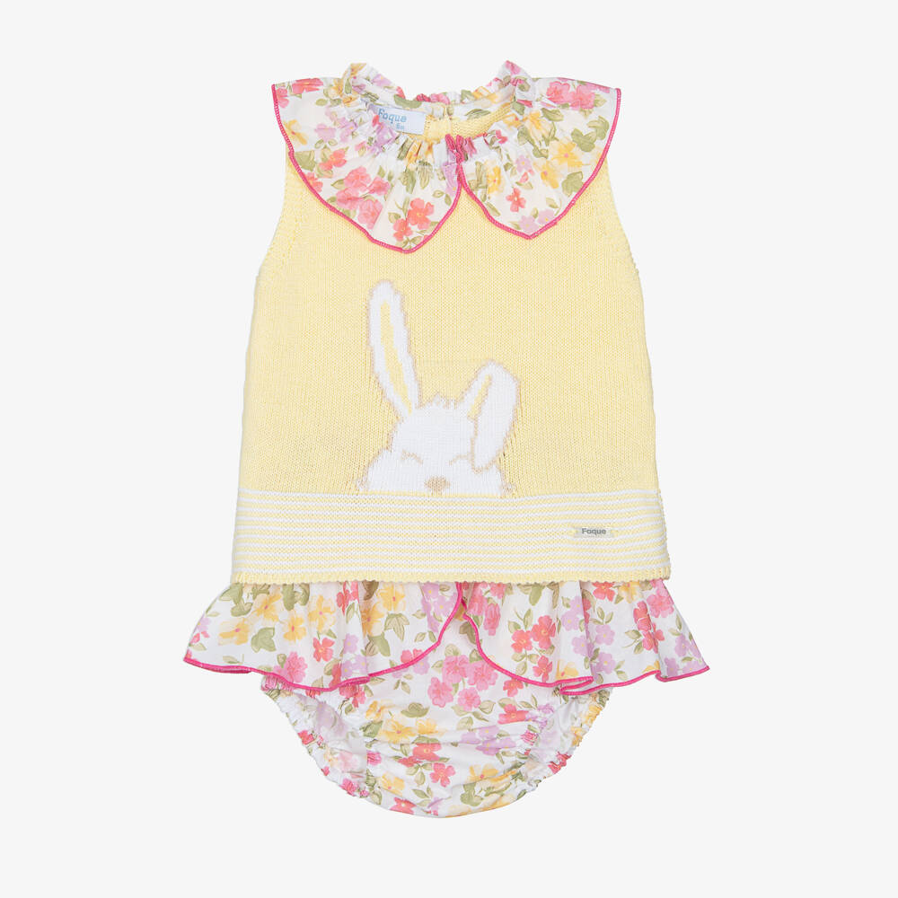 Cute shorts set for little girls from Foque, made in soft cotton. The yellow knitted top has an adorable bunny logo on the front and fastens with buttons on the back for a neat finish. The top has a floral printed collar which matches the shorts for a coordinated look. The shorts have hues of pink and yellow in the print and a ruffled overlay for a feminine touch. The waistband is elasticated for comfort and ease of dressing.