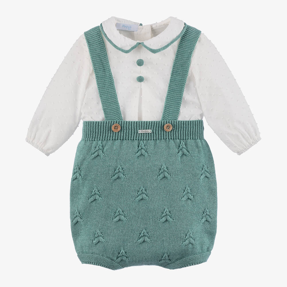 Charmingly traditional, this ivory & sea green shorts set for little boys and girls is by Foque. The long-sleeved top is made in lightweight cotton plumeti with matching green knitted trims and glistening mother-of-pearl buttons to fasten on the back. A simple, pull-on style, the cute bubble shorts are knitted in a cotton and wool blend. The fixed shoulder straps fasten to the front of the waist with wooden buttons.