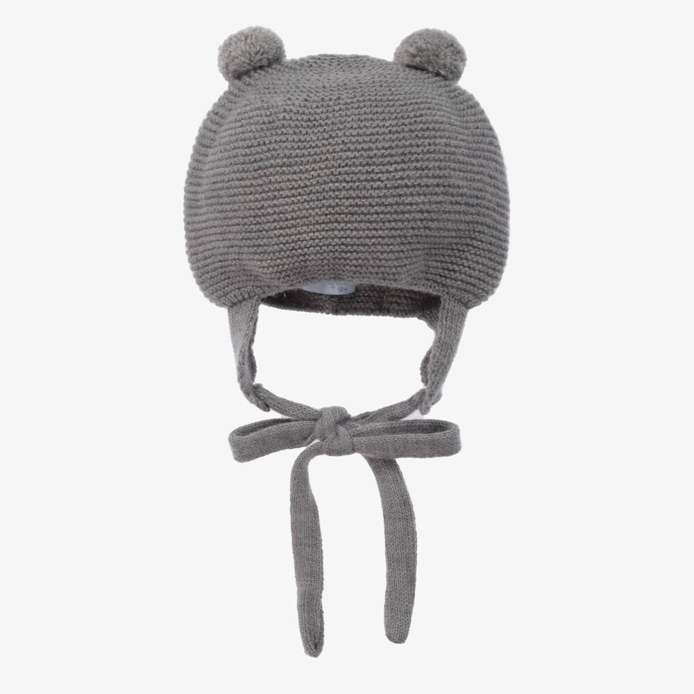 Adorable grey hat for little boys and girls by Spanish brand Foque, with two small pom-poms on the top. Softly knitted in a garter stitch pattern with a touch of alpaca wool for a luxurious feel, it fastens with knitted ties under the chin.