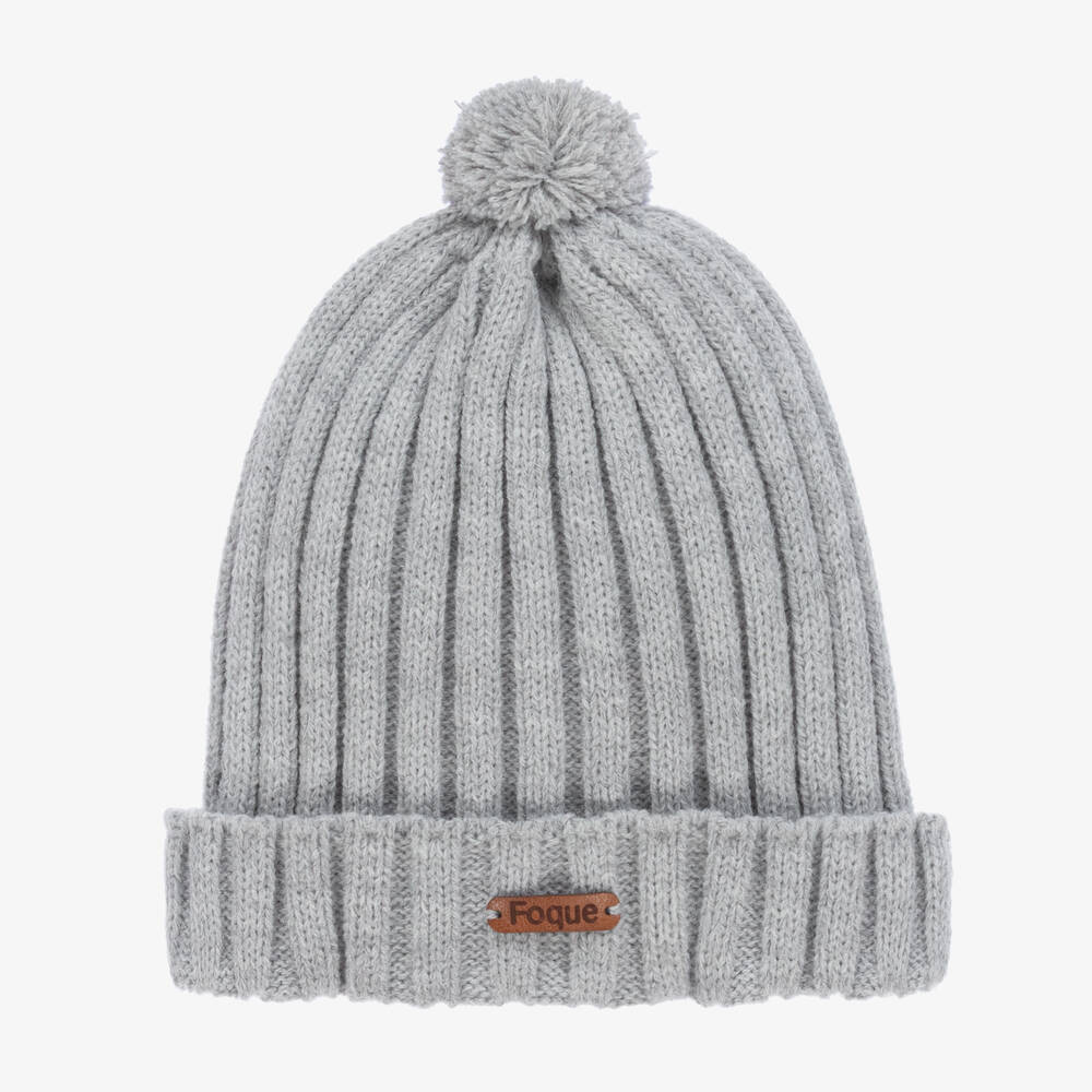 Cosy light grey hat for boys and girls from Foque, made in a beautifully soft knit. Great for colder days, it has a turned-up brim with a brown logo tab on the front and a small pom-pom on the top.
