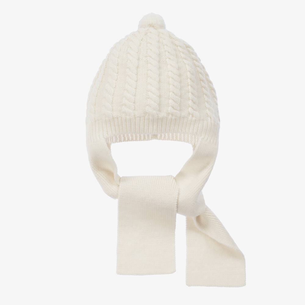 Adorable knitted hat for little boys and girls by Spanish brand, Foque. Comfortable and cosy, it has a lovely cable pattern and a cute pom-pom on the top. This practical style has an integrated scarf to tie around the neck, helping to keep out winter chills.