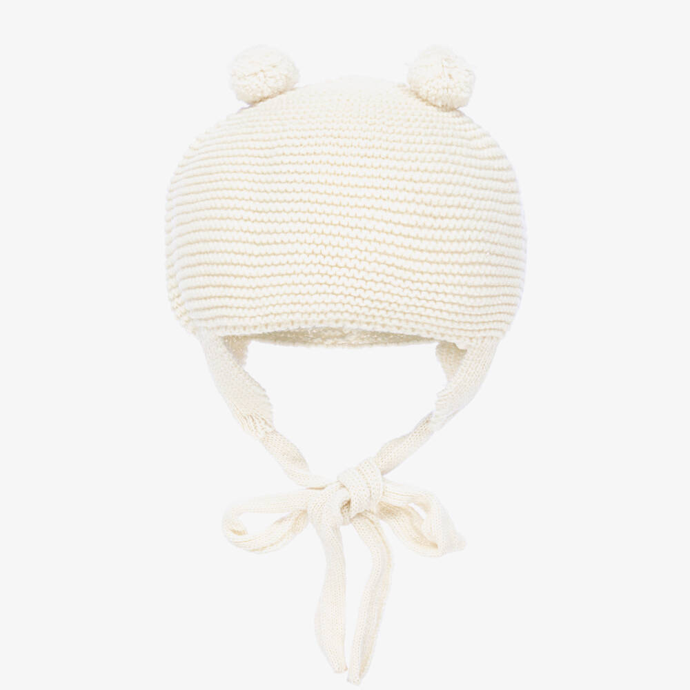 Cute ivory hat for little boys and girls by Foque, knitted in a soft wool blend. It has two small pom-poms on the top and ties under the chin to ensure a secure fit.