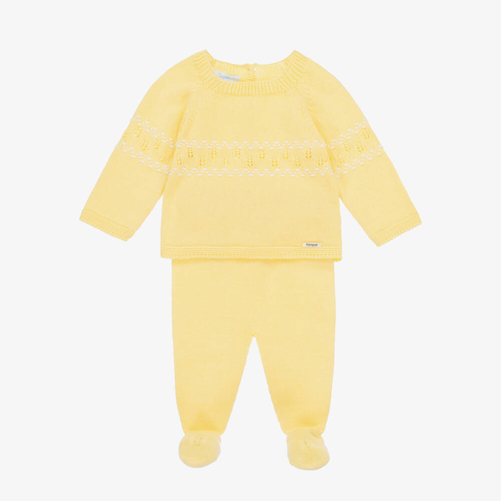 Sweet yellow two piece babygrow for boys and girls by classic brand Foque. Knitted in lightweight cotton, it has pretty white stitch detailing, with a leaf-style pattern.