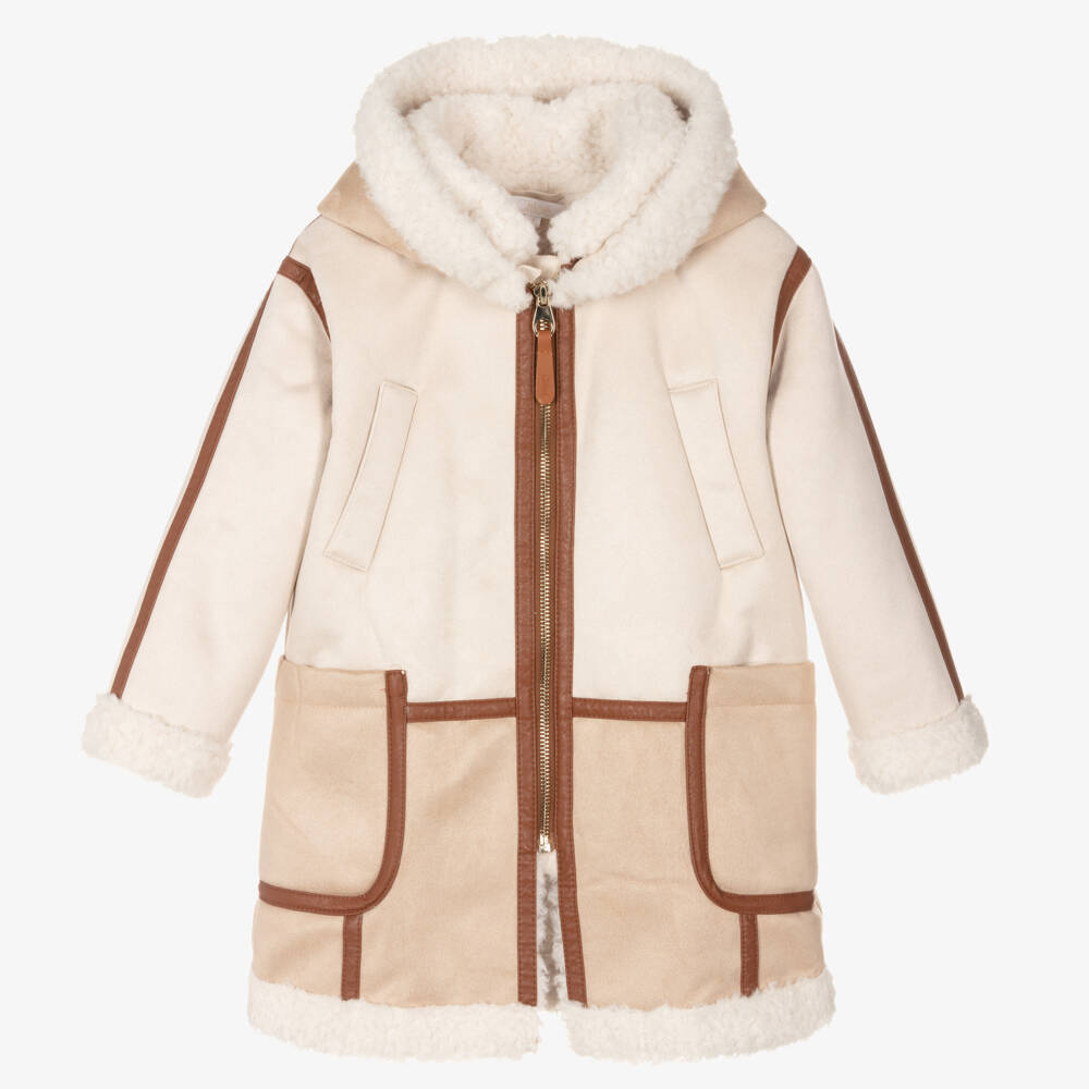 Made in soft faux suede, this ivory and beige hooded coat for girls from French label Chloé, is inspired by the adult collection. Beautifully warm, it is lined and trimmed with luxuriously soft sherpa fleece, with brown faux leather trims. It has a large detachable hood that attaches to the coat with buttons for extra cosiness. It fastens with a gold-tone zip with a branded zip pull and has chest pockets along with fleece-lined patch pockets on the front. This coat is made from recycled materials.