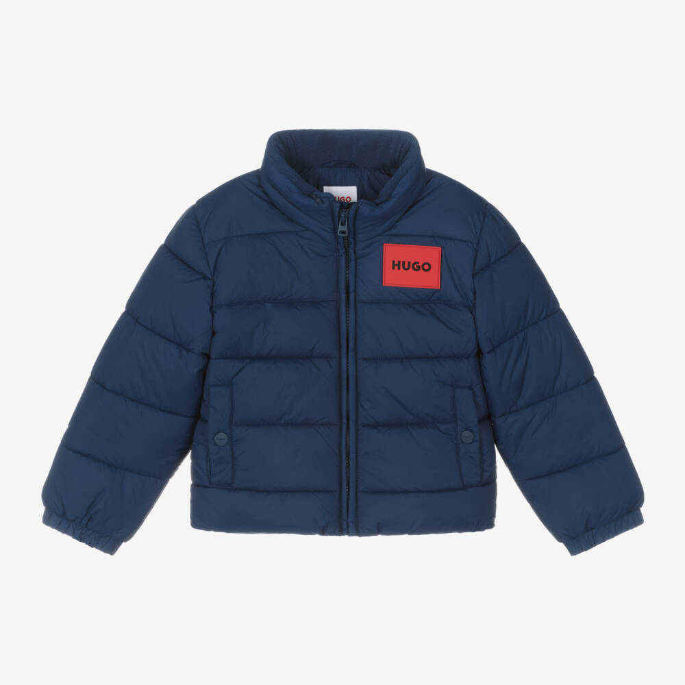 Stylish navy blue puffer jacket for boys by German brand HUGO, featuring the rubberised signature red logo patch. Zip fastening, this practical outerwear piece is silky smooth and water-repellent, with mid-weight padding for extra warmth. The design includes a lightweight hood, which can be tucked away neatly inside the fleece-lined collar when not in use. There are two front pockets with a cosy lining and branded popper fastenings. The main fabric contains at least 70% of recycled polyamide.