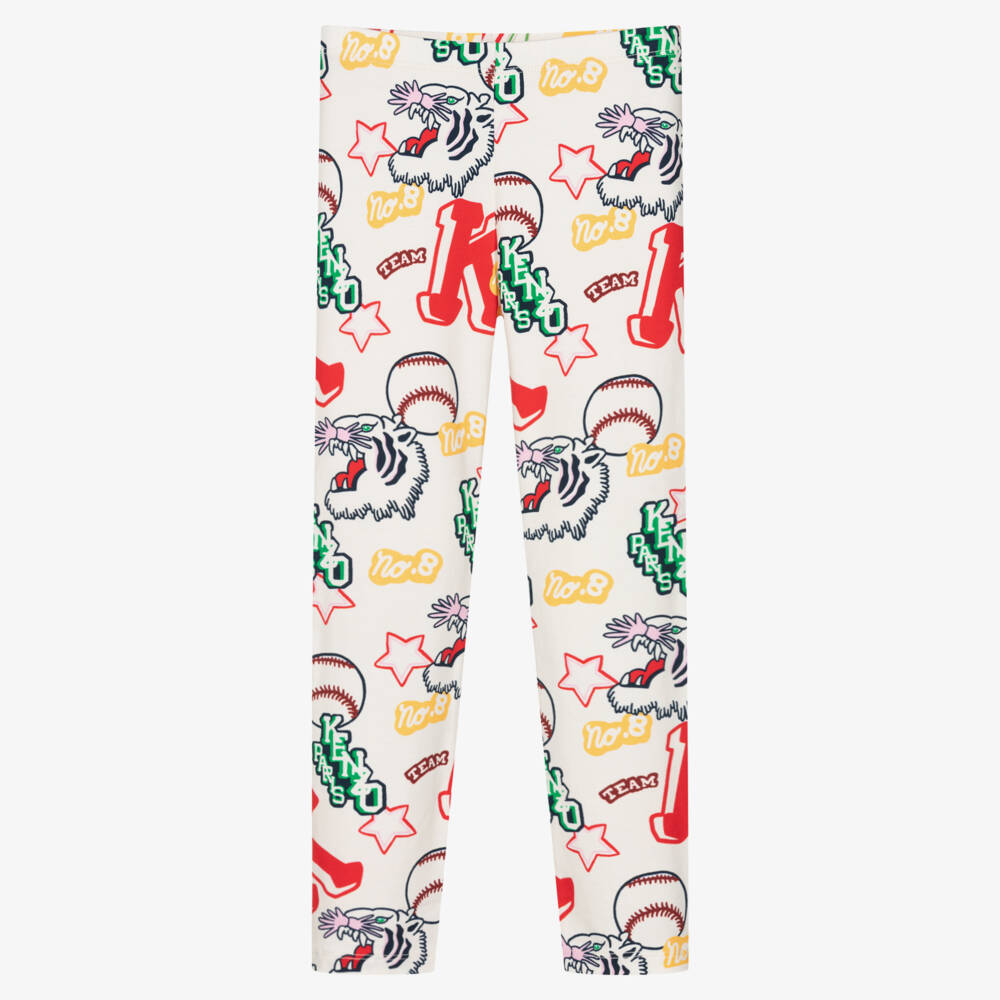 Ivory cotton leggings for girls by KENZO KIDS, made in soft and stretchy jersey. Bold and distinctive, these stand-out leggings are designed in an all-over baseball print incorporating the brand's 'K' motif and roaring Varsity Tiger. They have an elasticated waist for comfort and movement.