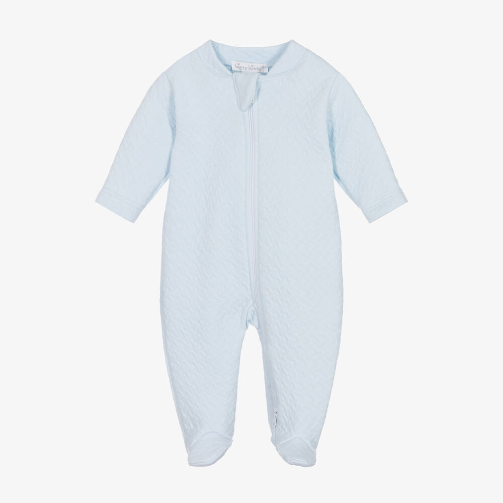 Lovely pale blue babygrow for boys by Kissy Kissy, made in soft Pima cotton jersey. With a soft quilted effect, it has a super easy zip fastening on the front for effortless dressing, and a chin guard flap at the top to protect your little one's neck.