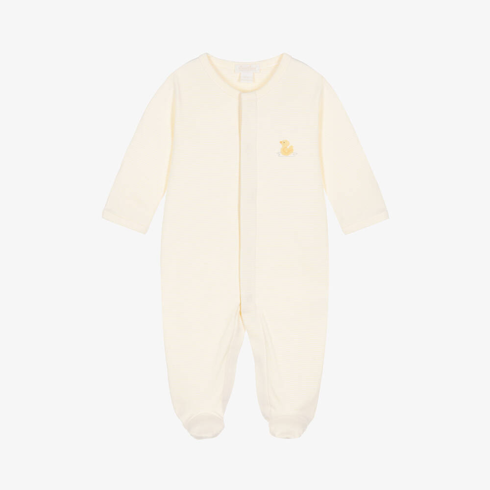 Yellow and white striped babygrow for boys and girls by Kissy Kissy, made in super soft and stretchy Pima cotton jersey. Gentle on delicate skin, this lovely babysuit has a cute hand-embroidered duckling on the chest. It fastens with poppers on the front and between the legs and has useful fold-over scratch mitts on smaller sizes.