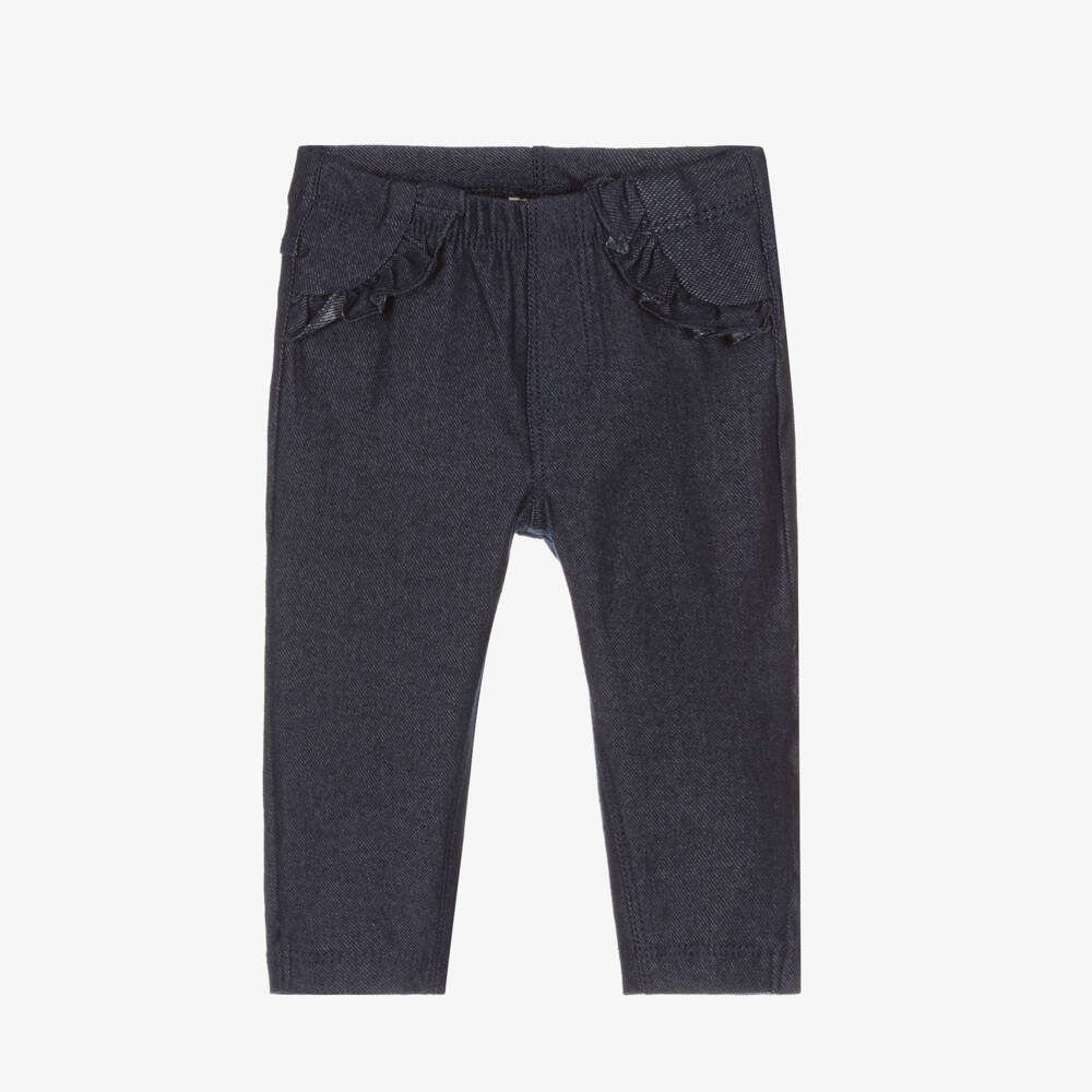 Navy blue denim-look leggings for baby girls by Danish brand Minymo. Made in a soft cotton blend jersey, they have pretty ruffle trims and an elasticated waistband.