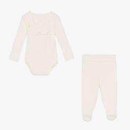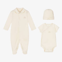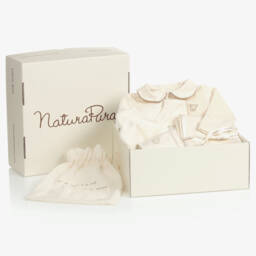 An ivory organic cotton babysuit set for boys and girls by Naturapura. The bodyvest and footed leggings are made from the softest jersey and can be worn together for an all-in-one look. The velour babygrow has a sweet Peter Pan collar with brown scalloped edging. All items are printed with a cute animal, and both babysuits fasten with poppers.