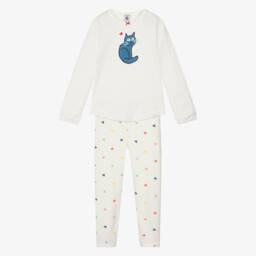 Ivory pyjamas for boys from French brand Petit Bateau, made in a soft and lightweight organic cotton jersey. Comfortable to wear, they have a fun tractor print, with blue Milleraise striped ribbed trims and an elasticated waistband for a good fit.