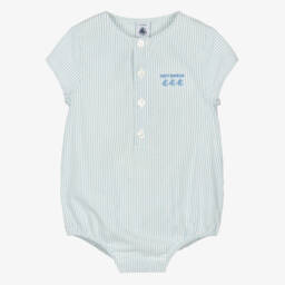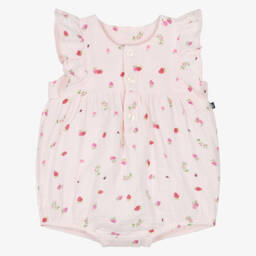 Ivory with a pretty red, yellow and green floral print, this lovely shortie for baby girls is by Petit Bateau. Woven in soft lightweight cotton, it has pretty ruffled sleeves and a gently elasticated waist. There are easy-fastening poppers on the back and between the elasticated legs.