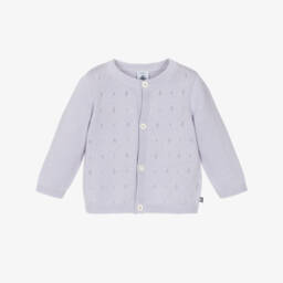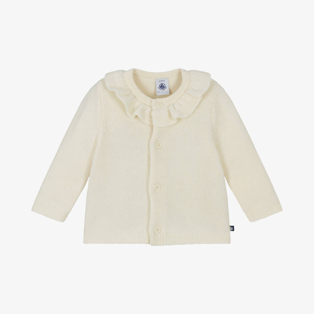 Girls ivory cardigan by Petit Bateau, knitted in a soft wool blend for cosy warmth. Styled with a ruffle collar, this layering piece fastens with tonal ivory buttons on the front and has a small logo tab stitched on the side seam.