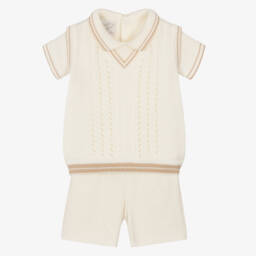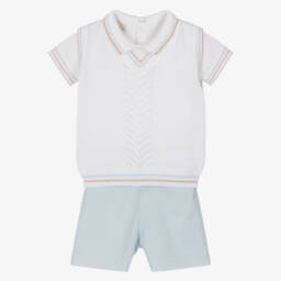 Navy blue cotton shorts set for little boys by Pretty Originals. The white, cotton-blend, short-sleeved shirt has a traditional, hand-embroidered and hand-smocked bib, with a coordinating blue, linen-look collar. There are turned-up cuffs on the short sleeves and button fastenings on the back. It pairs neatly with the coordinating shorts, which have adjustable cross-over straps that secure with adjustable buttons on the back.