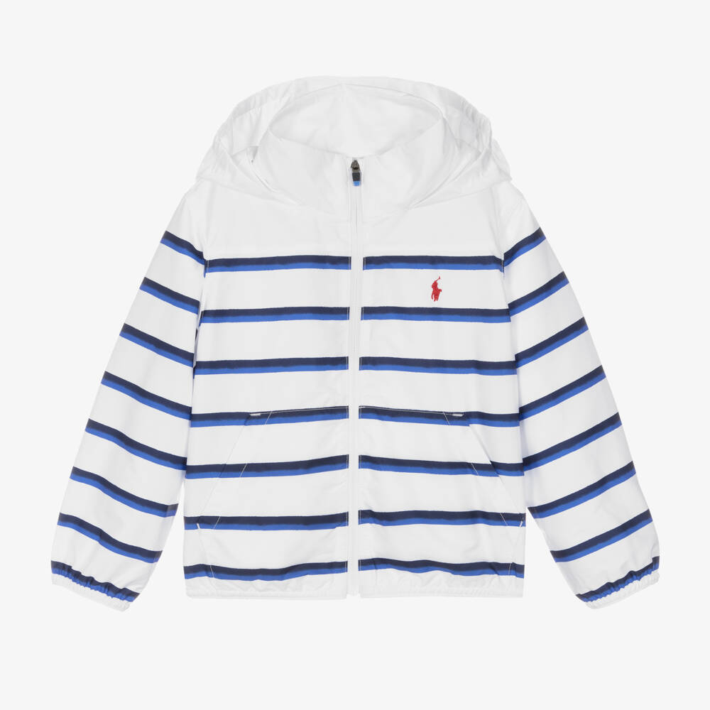 White windbreaker jacket for boys by Ralph Lauren, made in smooth recycled fabric, with a blue striped pattern. Lightweight and water repellent, this casual jacket has front pockets, an elasticated hem and cuffs and it fastens with a zip on the front. There is a fold-away hood and the jacket can be packed away inside one of the pockets for easy storage when not in use. The brand's signature pony logo is embroidered on the chest in red for instant designer recognition.