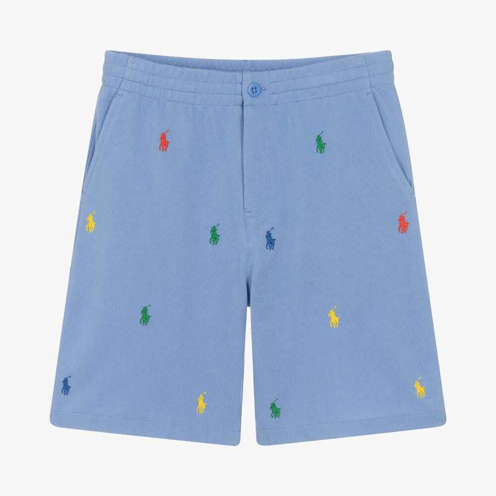 Casual shorts for teen boys in cornflower blue cotton piqué by Polo Ralph Lauren. The brand's signature pony logo is embroidered throughout for a splash of colour and fun. Comfortable for every day, they have two pockets on the front and two buttoned pockets on the back. They fasten with a button and zip on the front with an internal drawstring on the waist for an adjustable fit.