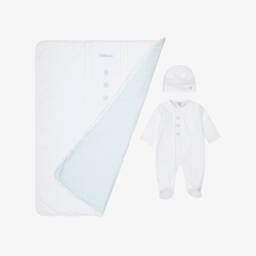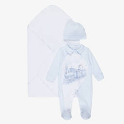 Adorable white two piece babygrow, bodyvest and hat set for baby girls, by Sofija. Made from beautifully soft cotton jersey, it has a lovely pink and blue floral design. The bodyvest and two piece babygrow fasten with poppers for easy dressing, and the layette hat has a cute knot detail on the top.